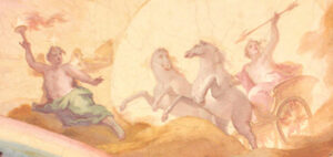 ヘリオスは日ごと4頭の馬に引かれた黄金(太陽)の戦車を馳せ、東の空から西の果ての外洋(オケアノス)へと天空を翔けぬけます。