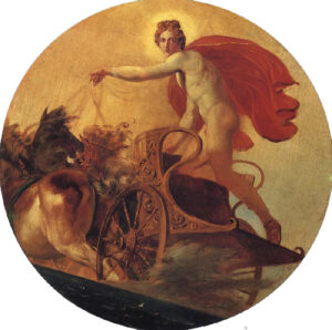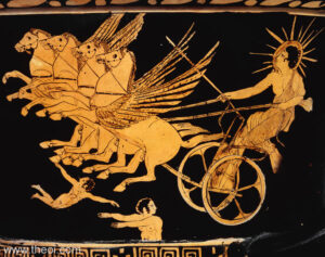 ヘリオスは光り輝く冠をかぶり、4頭の馬に引かれた戦車で、東に登り西に沈む天空を駆け抜けます。