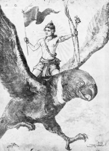 青い衣をまとい、オウムに乗り、伝説の海獣マカラ(象やワニのような尖った鼻を持ち、とぐろ巻く尾を持つ怪魚や、ワニとライオンの合成獣)が旗標。