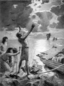 凄まじい嵐を7日耐え、生き延びたウトナピシュティムは神々に供物を捧げます。